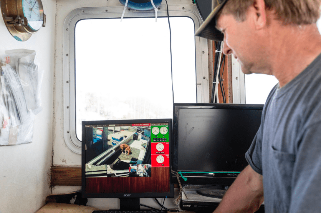 Cundy’s Harbor fisherman Bryan Bichrest in the wheelhouse viewing the monitor showing video feeds from all four of the cameras onboard his boat. Image © Heather Perry for The Nature Conservancy